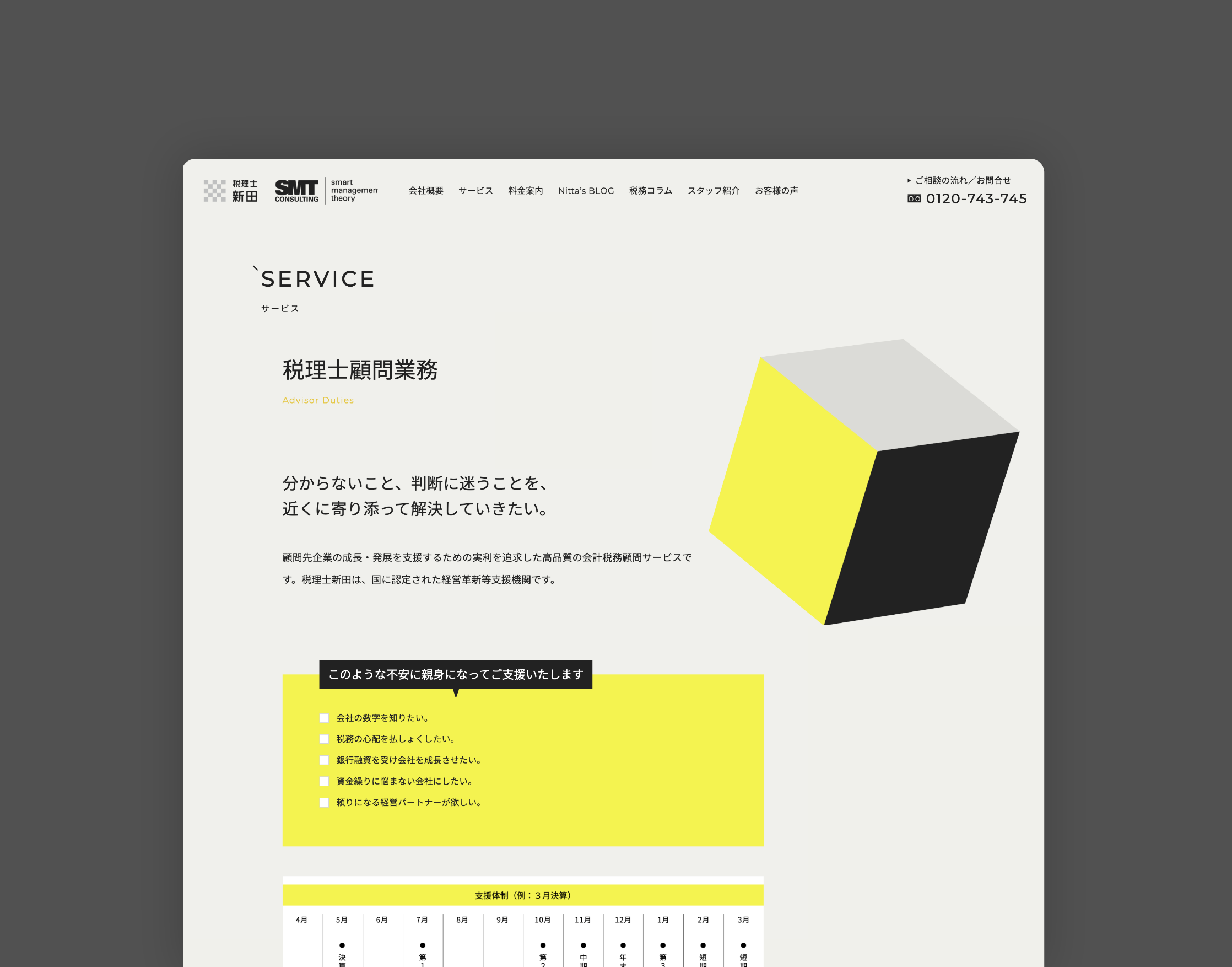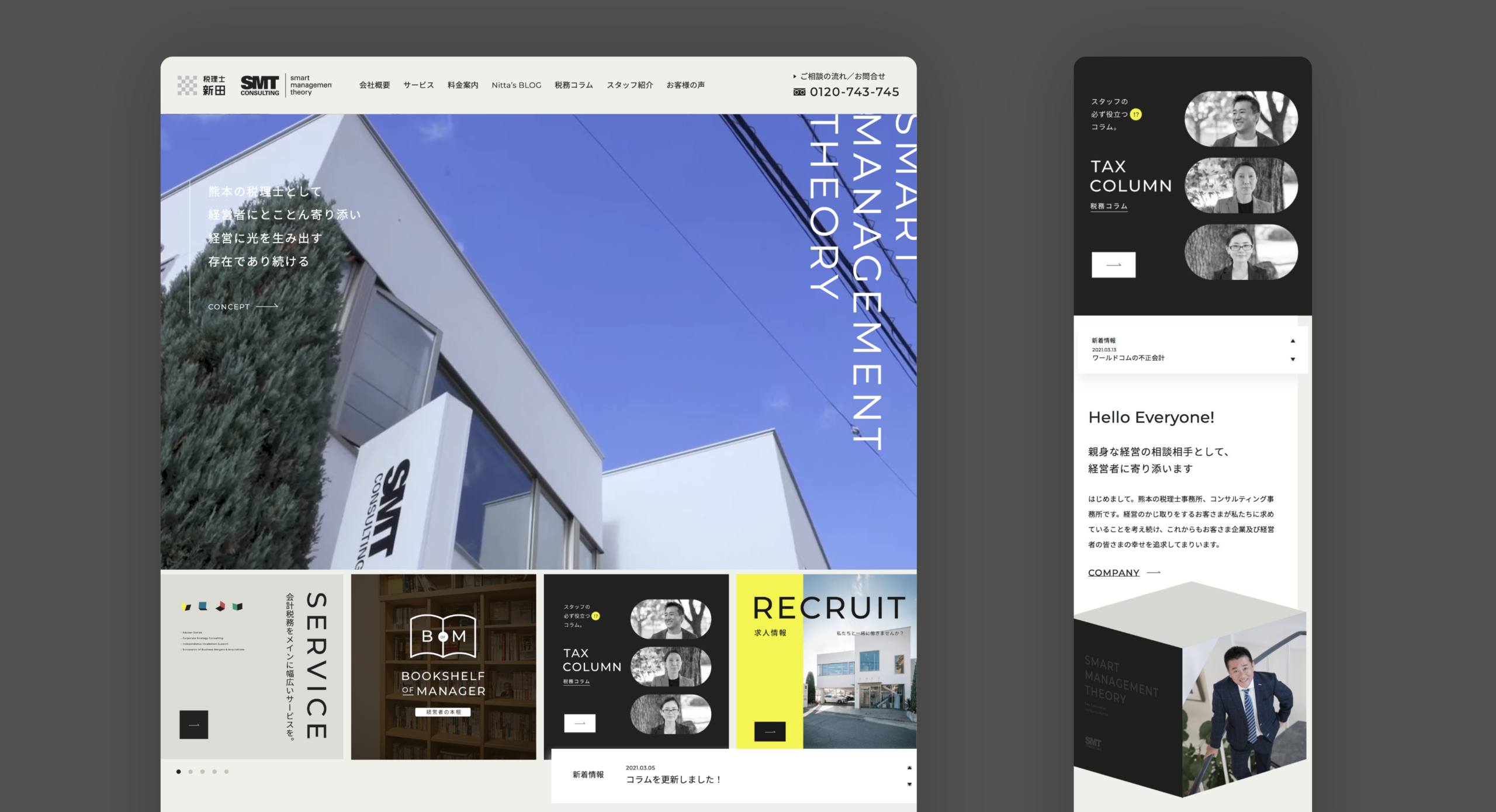 新田税理士事務所/SMTコンサルティング株式会社様のWebサイト制作。月次巡回監査や税務相談に加え、経営戦略、コンサルティングまで様々なニーズに応えてくれる力強いパートナーです。決して堅苦しくない柔軟なプロの企業カラーをデザインでお伝えできるよう表現しています。